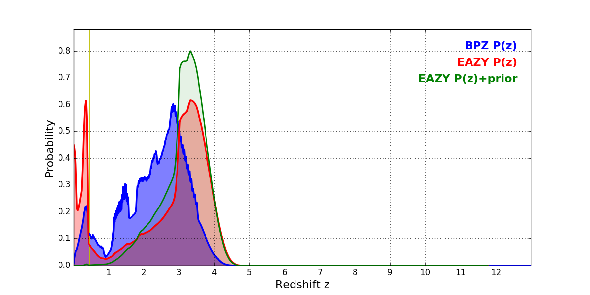 In P(z) plots: Yellow lines mark the cluster redshift z = 0.443,