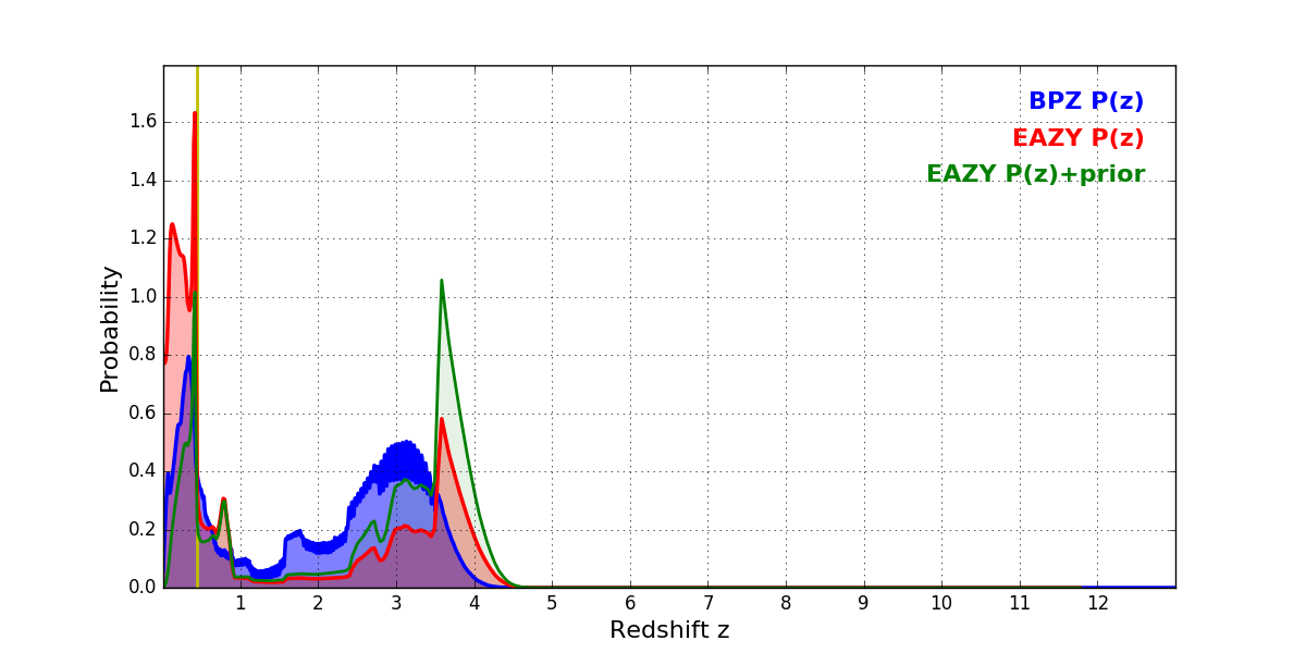 In P(z) plots: Yellow lines mark the cluster redshift z = 0.443,