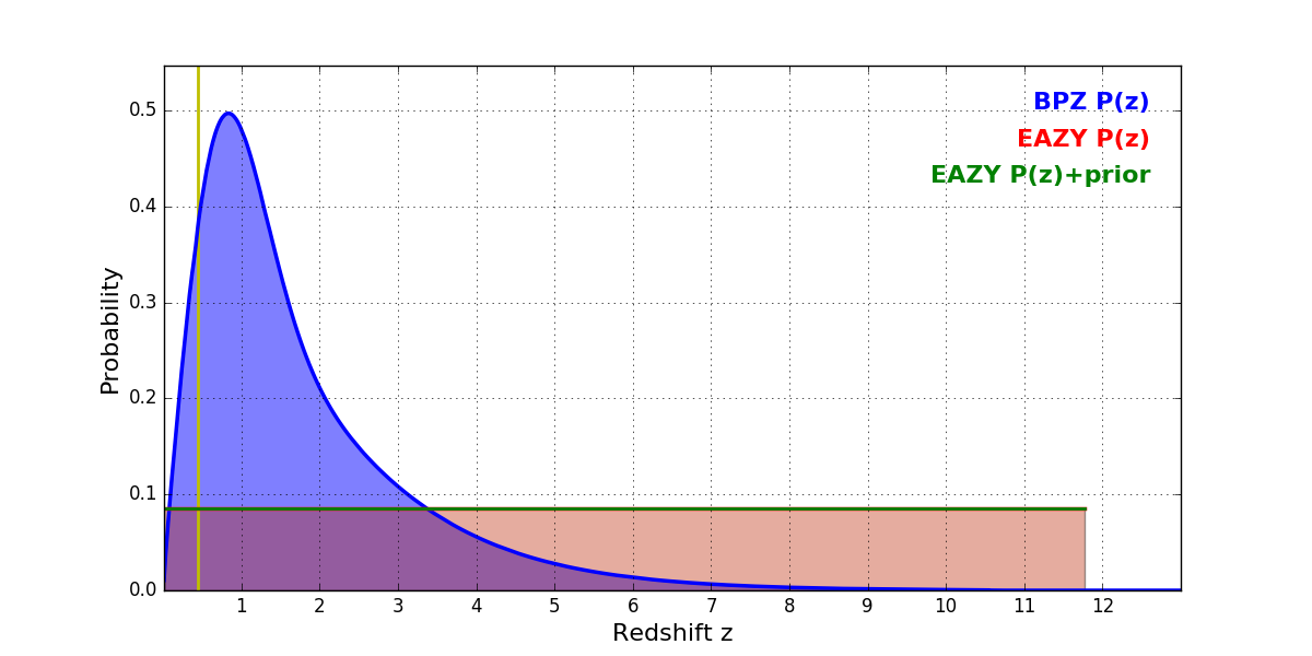 In P(z) plots: Yellow lines mark the cluster redshift z = 0.443,