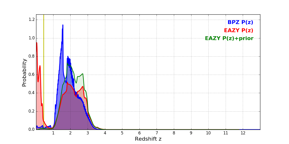 In P(z) plots: Yellow lines mark the cluster redshift z = 0.443,