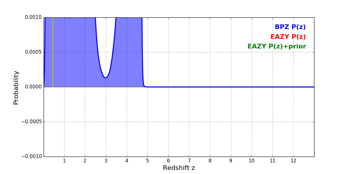 In P(z) plots: Yellow lines mark the cluster redshift z = 0.443,