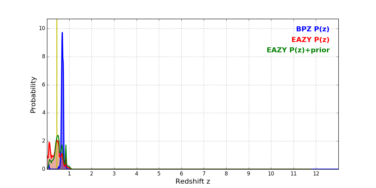 In P(z) plots: Yellow lines mark the cluster redshift z = 0.443,