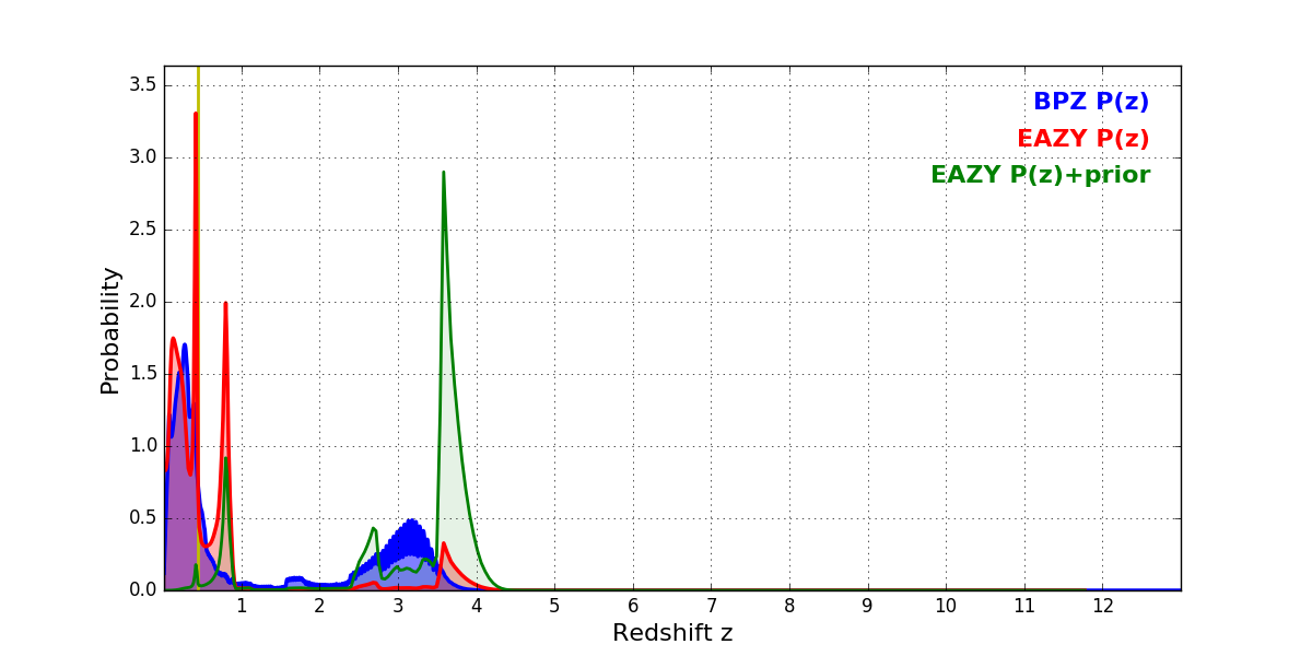In P(z) plots: Yellow lines mark the cluster redshift z = 0.443,