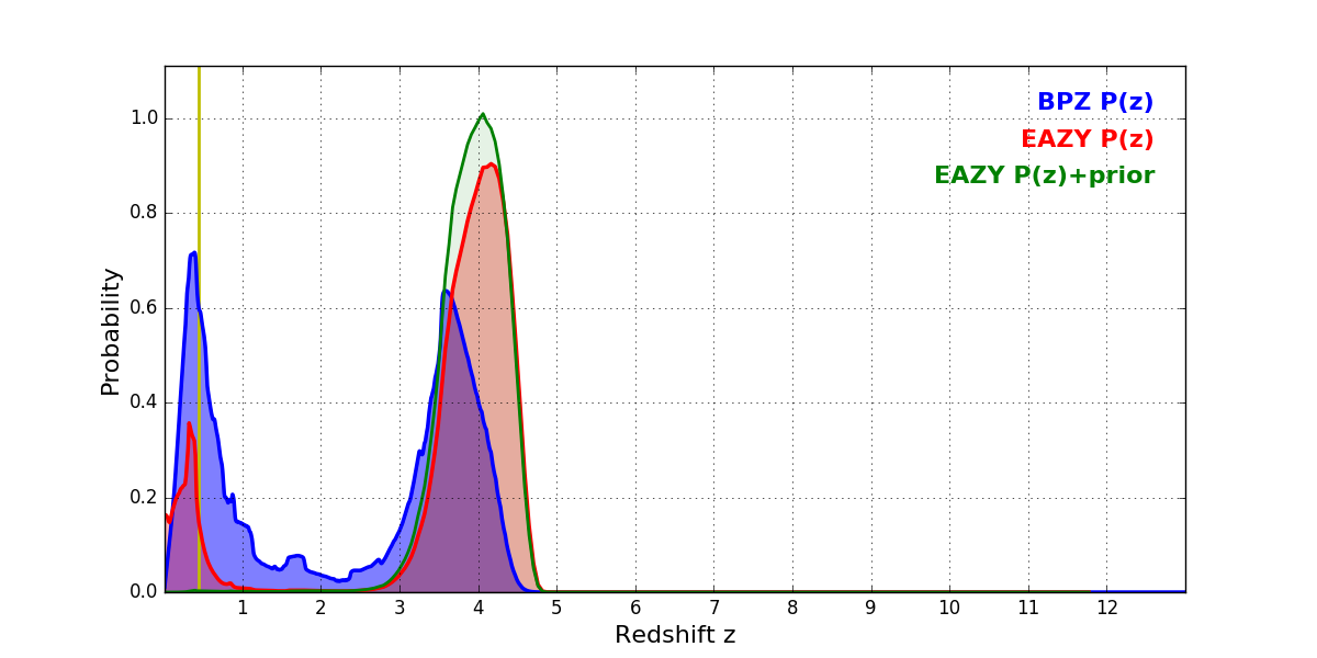 In P(z) plots: Yellow lines mark the cluster redshift z = 0.443,