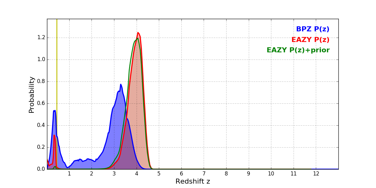 In P(z) plots: Yellow lines mark the cluster redshift z = 0.443,