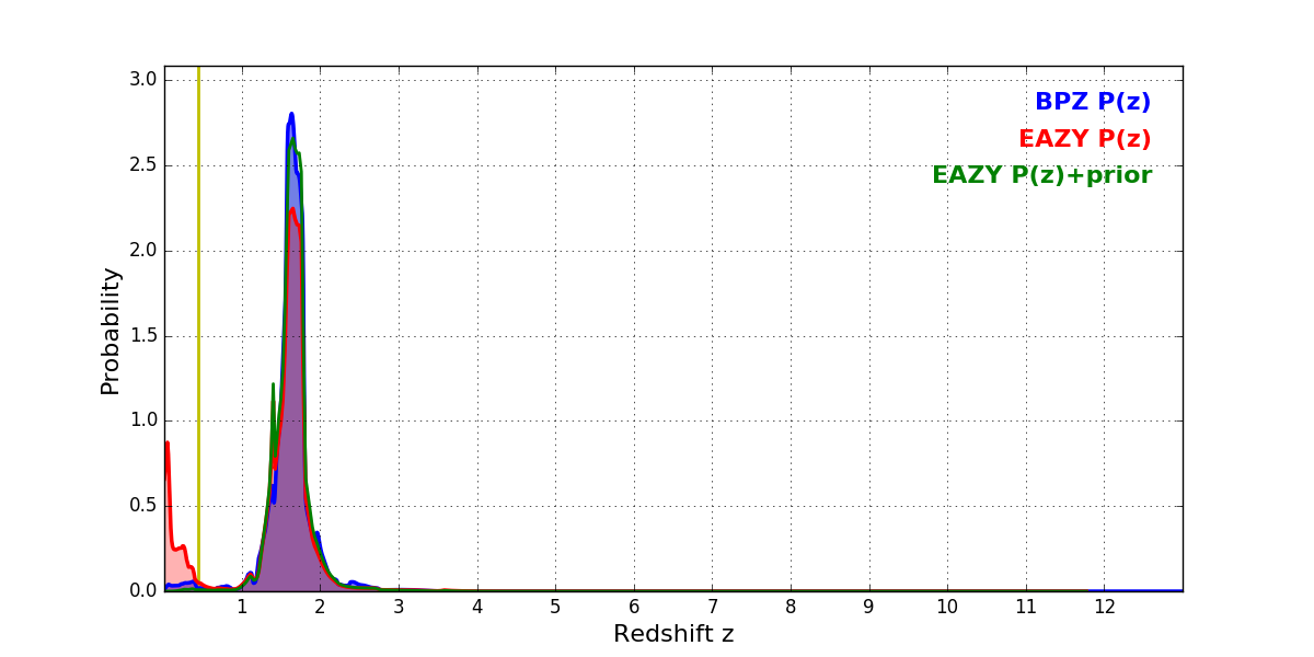In P(z) plots: Yellow lines mark the cluster redshift z = 0.443,