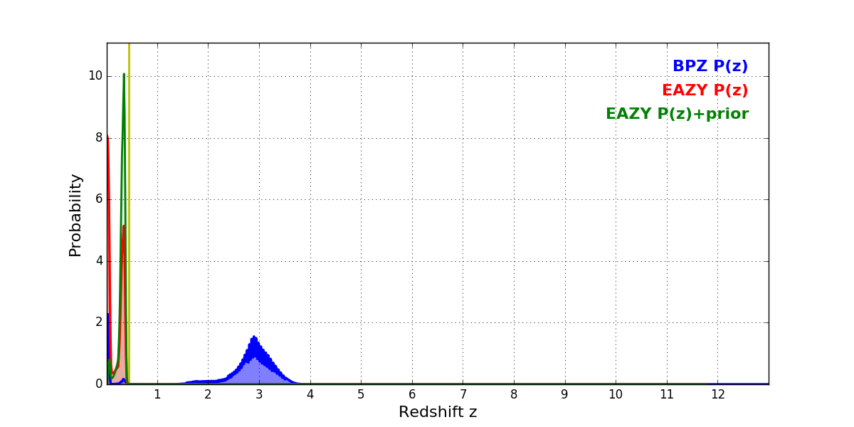 In P(z) plots: Yellow lines mark the cluster redshift z = 0.443,