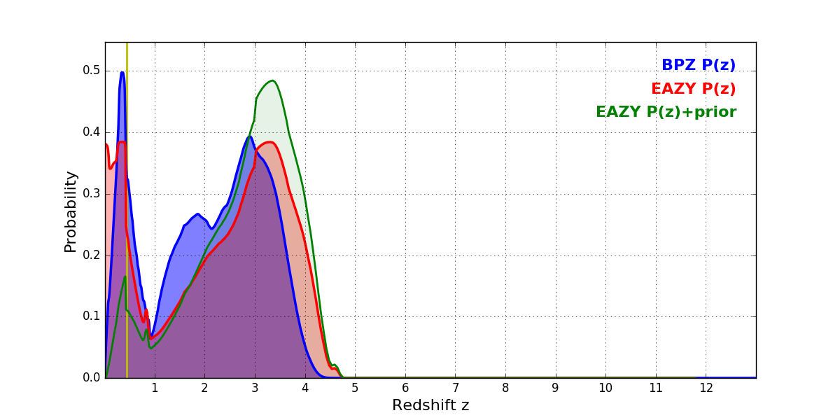 In P(z) plots: Yellow lines mark the cluster redshift z = 0.443,
