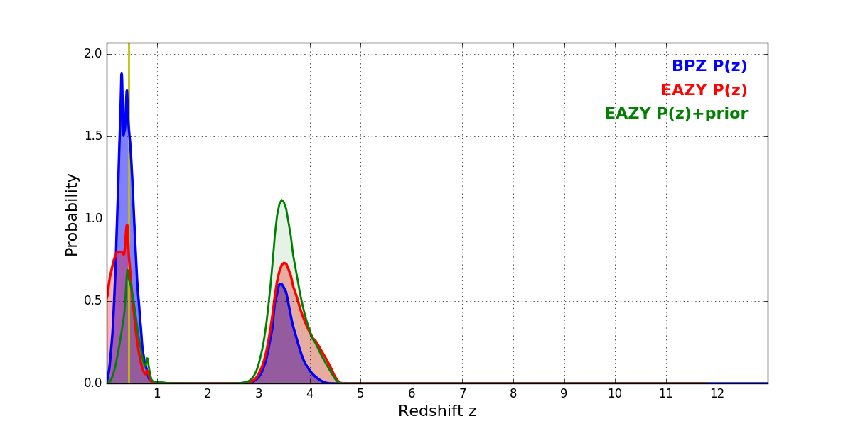 In P(z) plots: Yellow lines mark the cluster redshift z = 0.443,