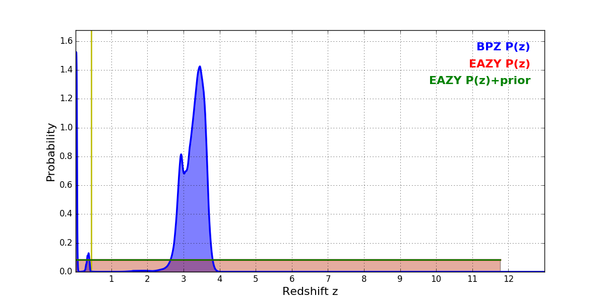 In P(z) plots: Yellow lines mark the cluster redshift z = 0.443,