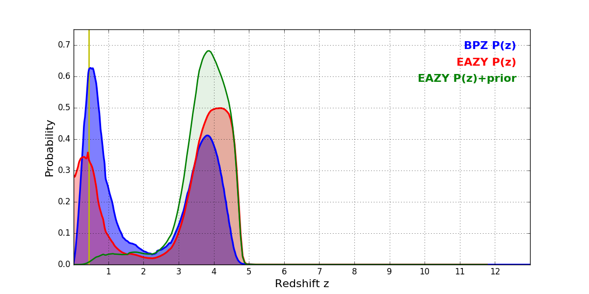 In P(z) plots: Yellow lines mark the cluster redshift z = 0.443,