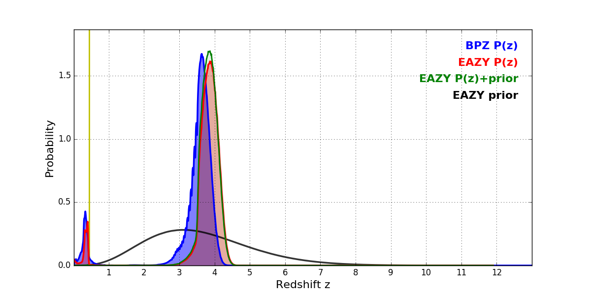In P(z) plots: Yellow lines mark the cluster redshift z = 0.443,