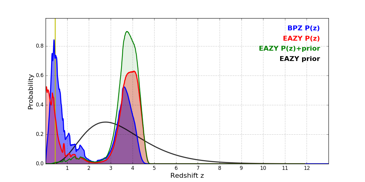 In P(z) plots: Yellow lines mark the cluster redshift z = 0.443,