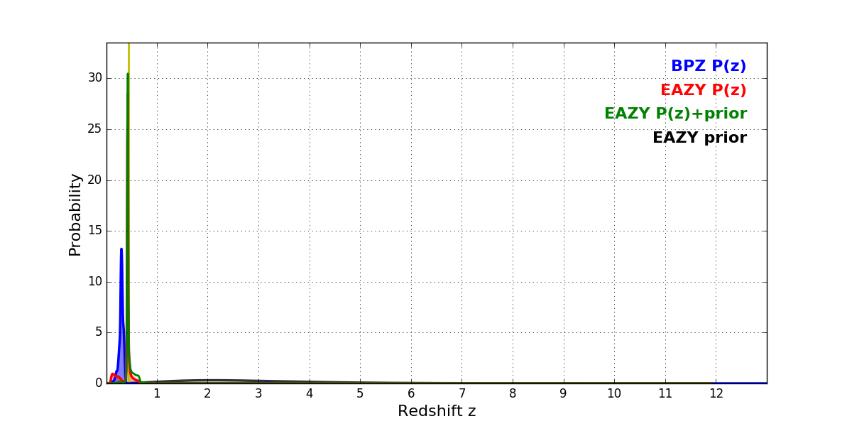 In P(z) plots: Yellow lines mark the cluster redshift z = 0.443,