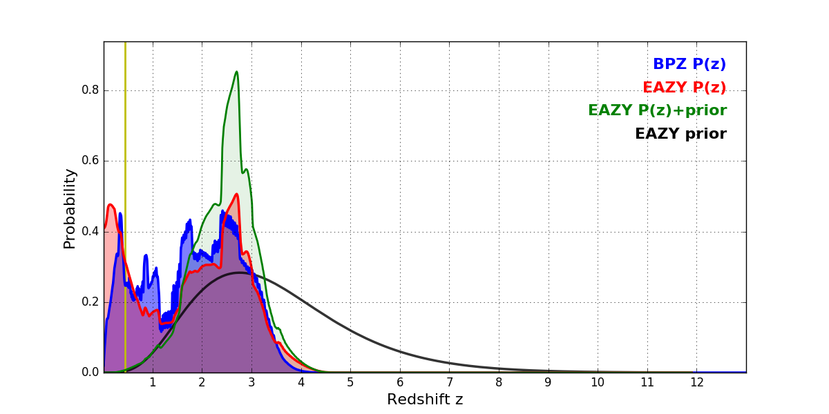 In P(z) plots: Yellow lines mark the cluster redshift z = 0.443,
