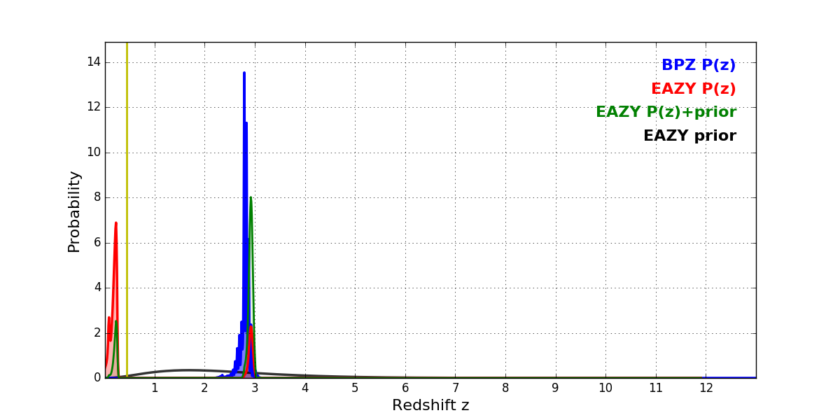 In P(z) plots: Yellow lines mark the cluster redshift z = 0.443,