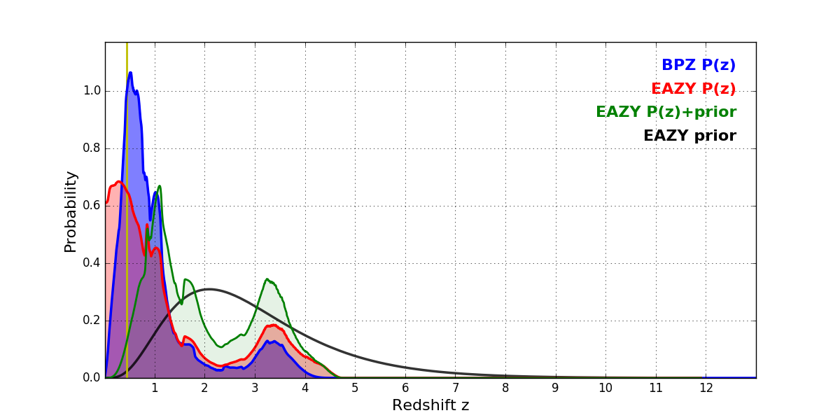 In P(z) plots: Yellow lines mark the cluster redshift z = 0.443,