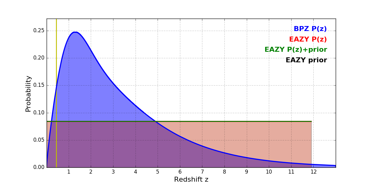 In P(z) plots: Yellow lines mark the cluster redshift z = 0.443,