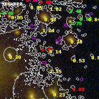 Object #3916 x,y = (2606, 2628) RA, Dec = (19:17:04.392, -33:31:18.12) = (289.26830, -33.52170) BPZ = 0.142 [0.094--0.213] type = 1.90 (Ell6_A_0 - Ell7_A_0) chisq2 = 0.57 ODDS = 0.88 z_cluster = 0.540
