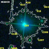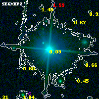Object #199 x,y = (1267, 3296) RA, Dec = (19:17:08.400, -33:30:07.92) = (289.28500, -33.50220) BPZ = 0.094 [0.019--0.211] type = 8.20 (SB1_B10 - SB2_B10) chisq2 = 0.02 ODDS = 0.67 z_cluster = 0.540