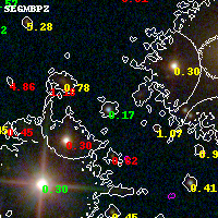 Object #7060 x,y = (2678, 1251) RA, Dec = (19:17:01.632, -33:32:10.68) = (289.25680, -33.53630) BPZ = 0.173 [0.133--0.212] type = 9.80 (SB3_B10 - SB2_B10) chisq2 = 0.35 ODDS = 0.98 z_cluster = 0.540