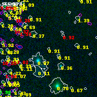 Object #7541 x,y = (303, 720) RA, Dec = (19:17:13.032, -33:32:42.36) = (289.30430, -33.54510) BPZ = 0.907 [0.585--5.324] type = 5.90 (Sbc_B10 - ES0_B10) chisq2 = 0.08 ODDS = 0.19 z_cluster = 0.540