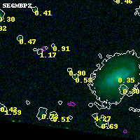 Object #8012 x,y = (1217, 511) RA, Dec = (19:17:08.640, -33:32:54.96) = (289.28600, -33.54860) BPZ = 0.903 [0.592--1.629] type = 5.90 (Sbc_B10 - ES0_B10) chisq2 = 0.01 ODDS = 0.31 z_cluster = 0.540