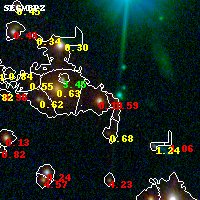Object #13 x,y = (2212, 3399) RA, Dec = (19:17:03.864, -33:30:01.80) = (289.26610, -33.50050) BPZ = 0.103 [0.057--0.175] type = 2.00 (Ell6_A_0) chisq2 = 2.46 ODDS = 0.80 z_cluster = 0.540