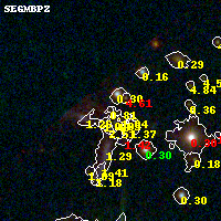 Object #417 x,y = (1079, 2723) RA, Dec = (19:17:09.312, -33:30:42.48) = (289.28880, -33.51180) BPZ = 0.814 [0.278--4.934] type = 7.00 (Scd_B10) chisq2 = 0.23 ODDS = 0.15 z_cluster = 0.540