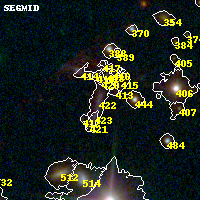 Object #422 x,y = (1075, 2686) RA, Dec = (19:17:09.312, -33:30:44.64) = (289.28880, -33.51240) BPZ = 1.288 [0.135--2.063] type = 9.00 (SB2_B10) chisq2 = 0.00 ODDS = 0.19 z_cluster = 0.540