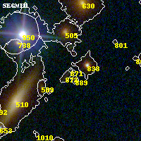 Object #871 x,y = (1967, 2352) RA, Dec = (19:17:05.040, -33:31:04.44) = (289.27100, -33.51790) BPZ = 0.403 [0.147--3.941] type = 9.90 (SB3_B10 - SB2_B10) chisq2 = 0.44 ODDS = 0.21 z_cluster = 0.540