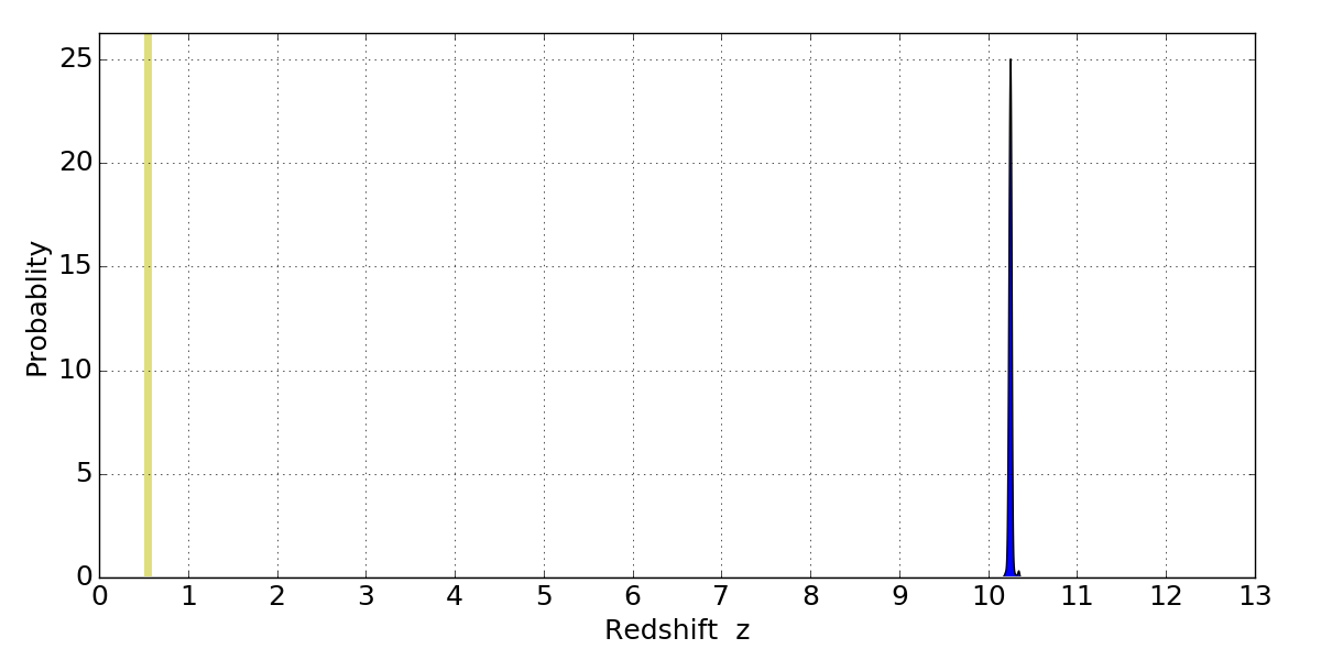 In P(z) plots: Yellow lines mark the cluster redshift z = 0.540,