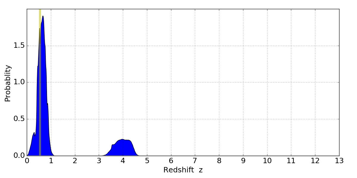 In P(z) plots: Yellow lines mark the cluster redshift z = 0.540,