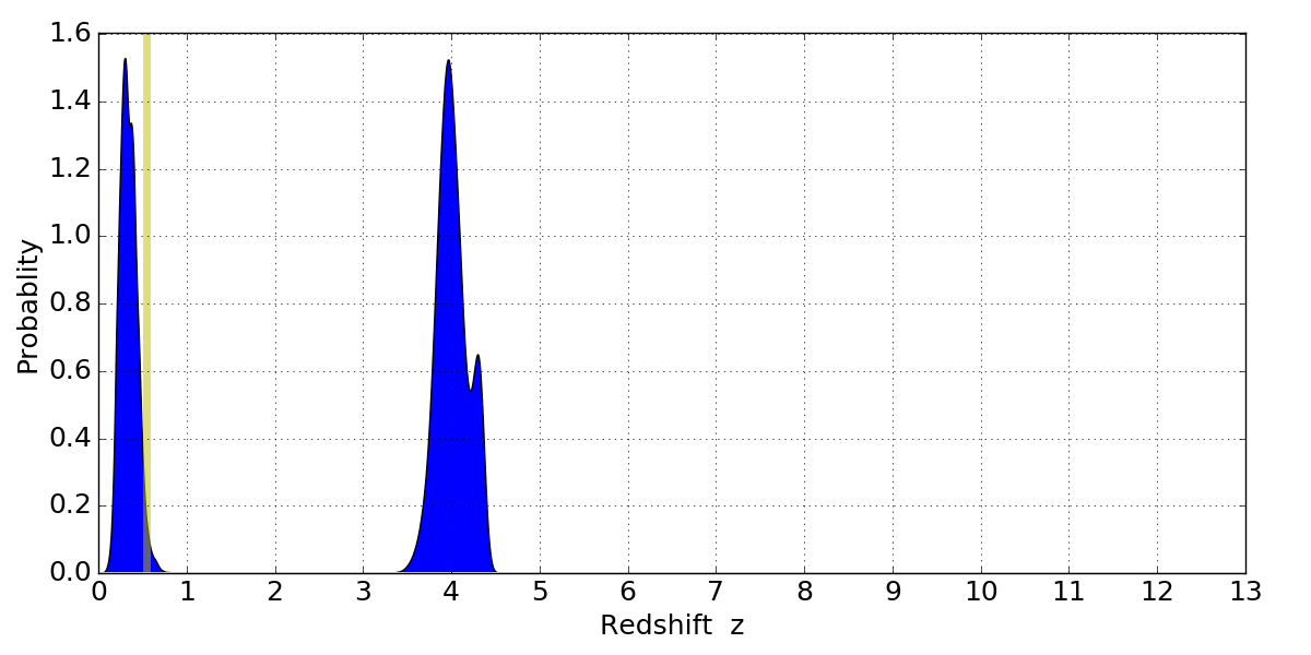 In P(z) plots: Yellow lines mark the cluster redshift z = 0.540,