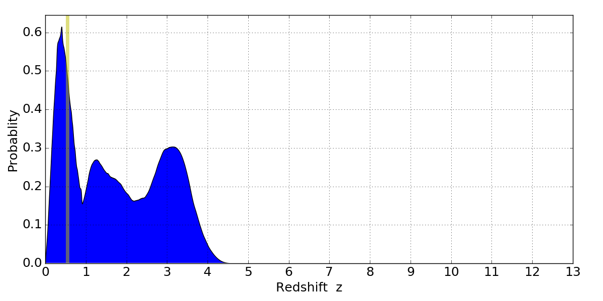 In P(z) plots: Yellow lines mark the cluster redshift z = 0.540,