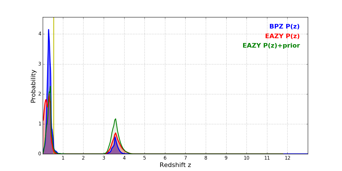 In P(z) plots: Yellow lines mark the cluster redshift z = 0.540,