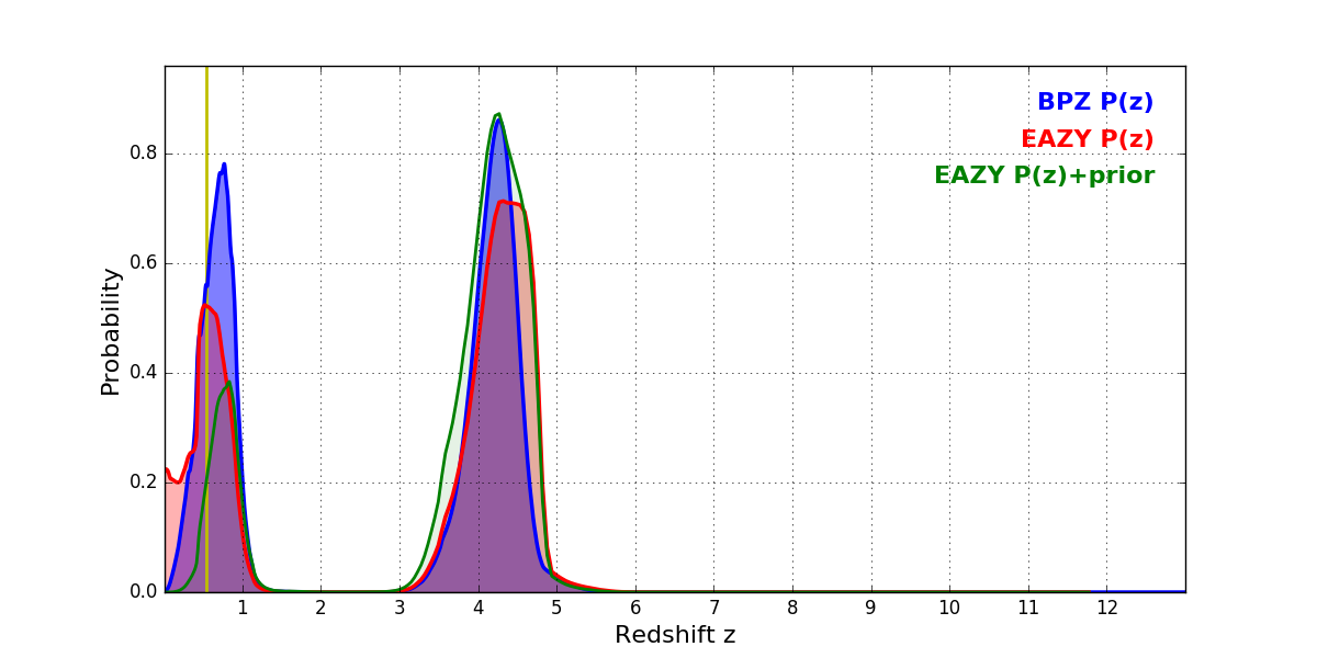 In P(z) plots: Yellow lines mark the cluster redshift z = 0.540,