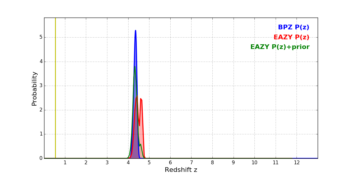 In P(z) plots: Yellow lines mark the cluster redshift z = 0.540,