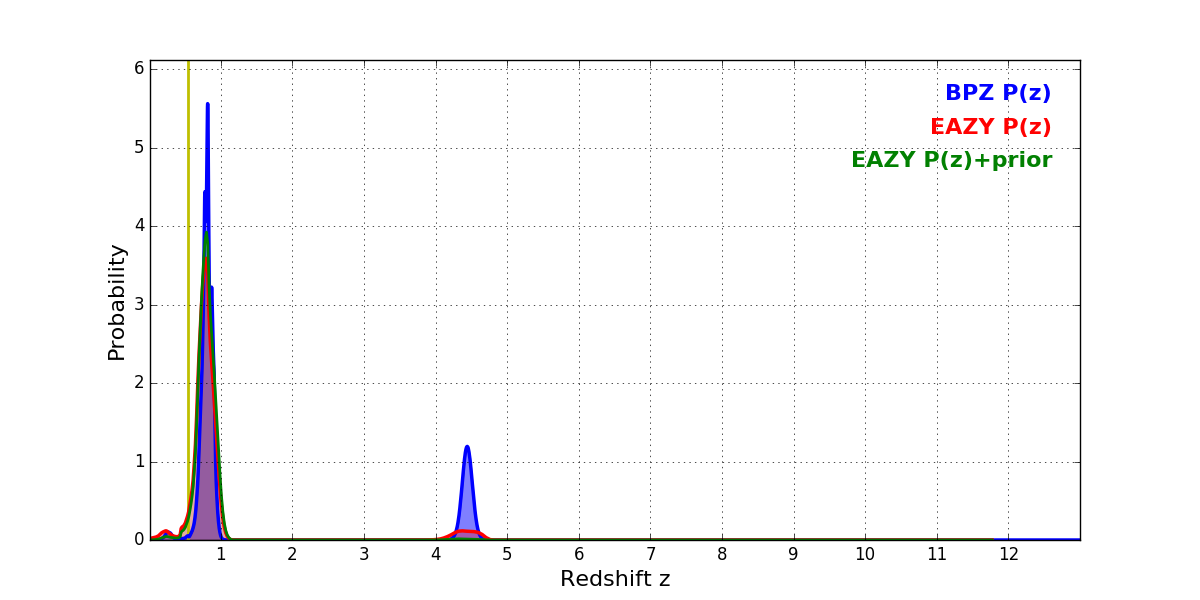 In P(z) plots: Yellow lines mark the cluster redshift z = 0.540,