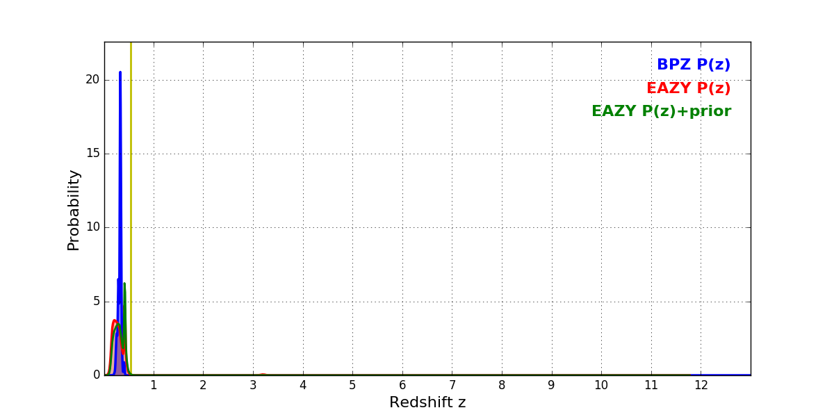 In P(z) plots: Yellow lines mark the cluster redshift z = 0.540,