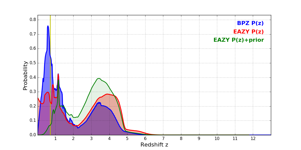 In P(z) plots: Yellow lines mark the cluster redshift z = 0.702,