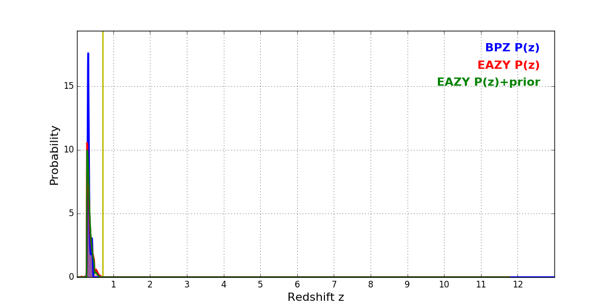 In P(z) plots: Yellow lines mark the cluster redshift z = 0.702,