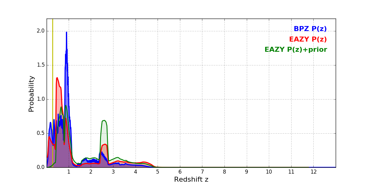 In P(z) plots: Yellow lines mark the cluster redshift z = 0.270,