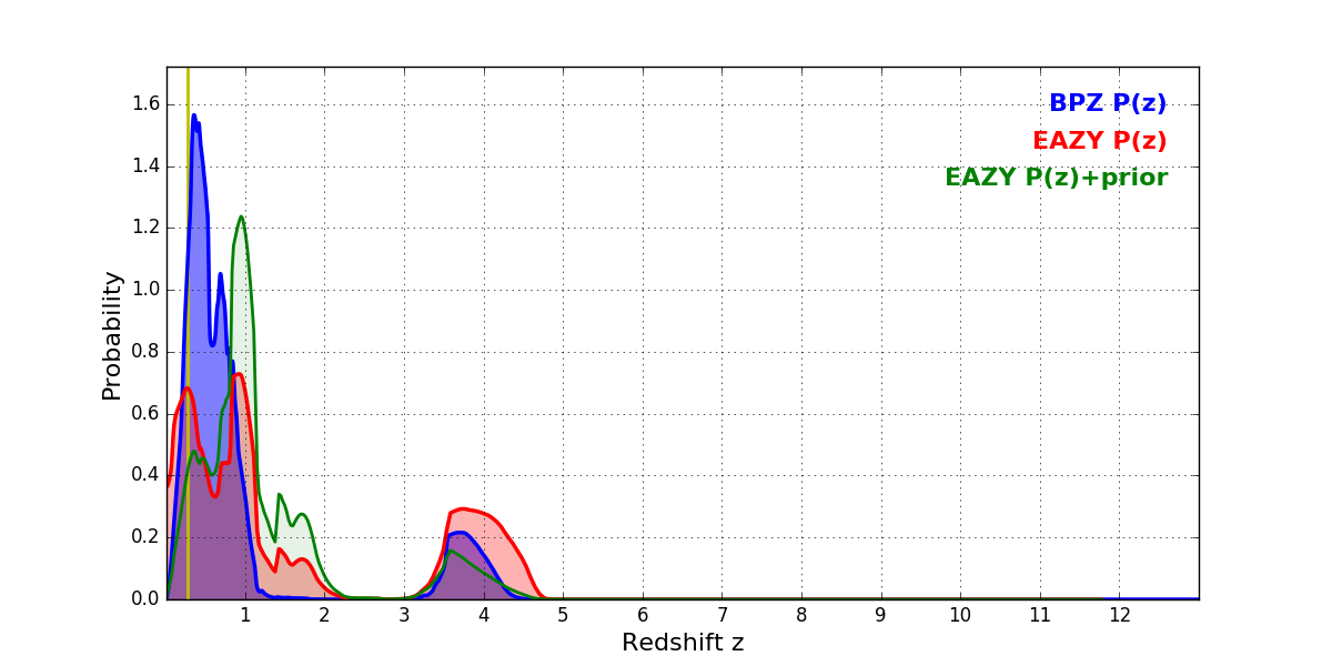 In P(z) plots: Yellow lines mark the cluster redshift z = 0.270,