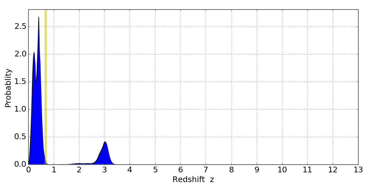 In P(z) plots: Yellow lines mark the cluster redshift z = 0.677,