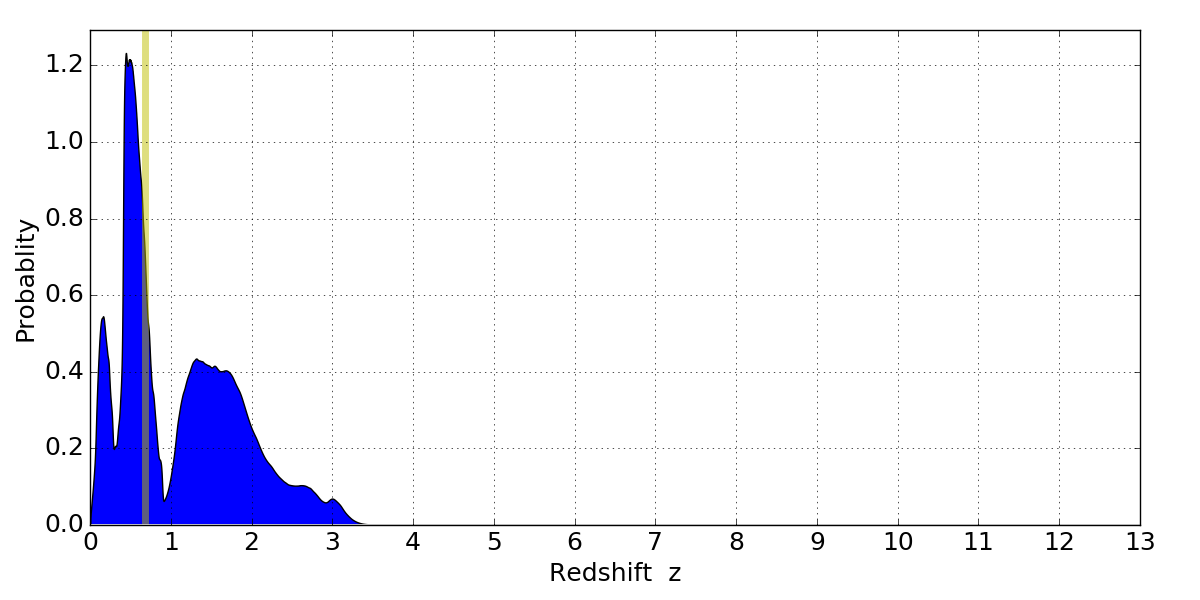In P(z) plots: Yellow lines mark the cluster redshift z = 0.677,
