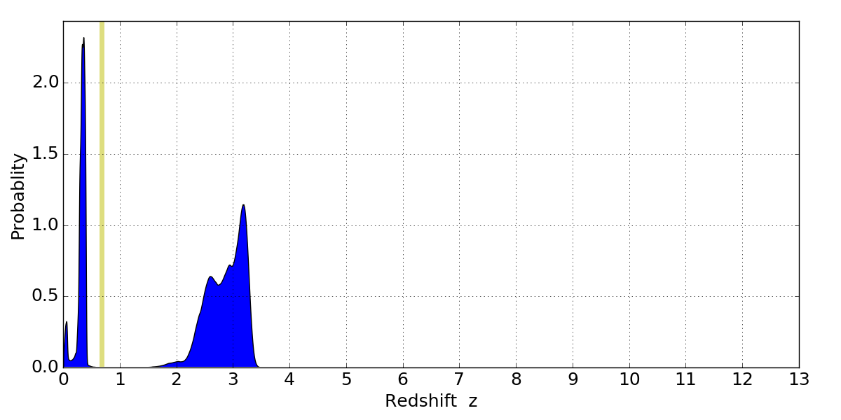 In P(z) plots: Yellow lines mark the cluster redshift z = 0.677,