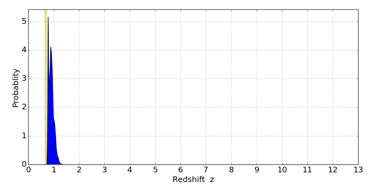 In P(z) plots: Yellow lines mark the cluster redshift z = 0.677,