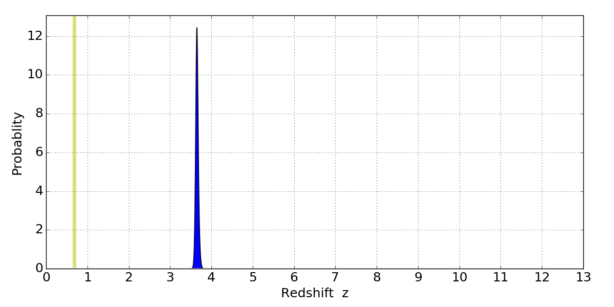 In P(z) plots: Yellow lines mark the cluster redshift z = 0.677,