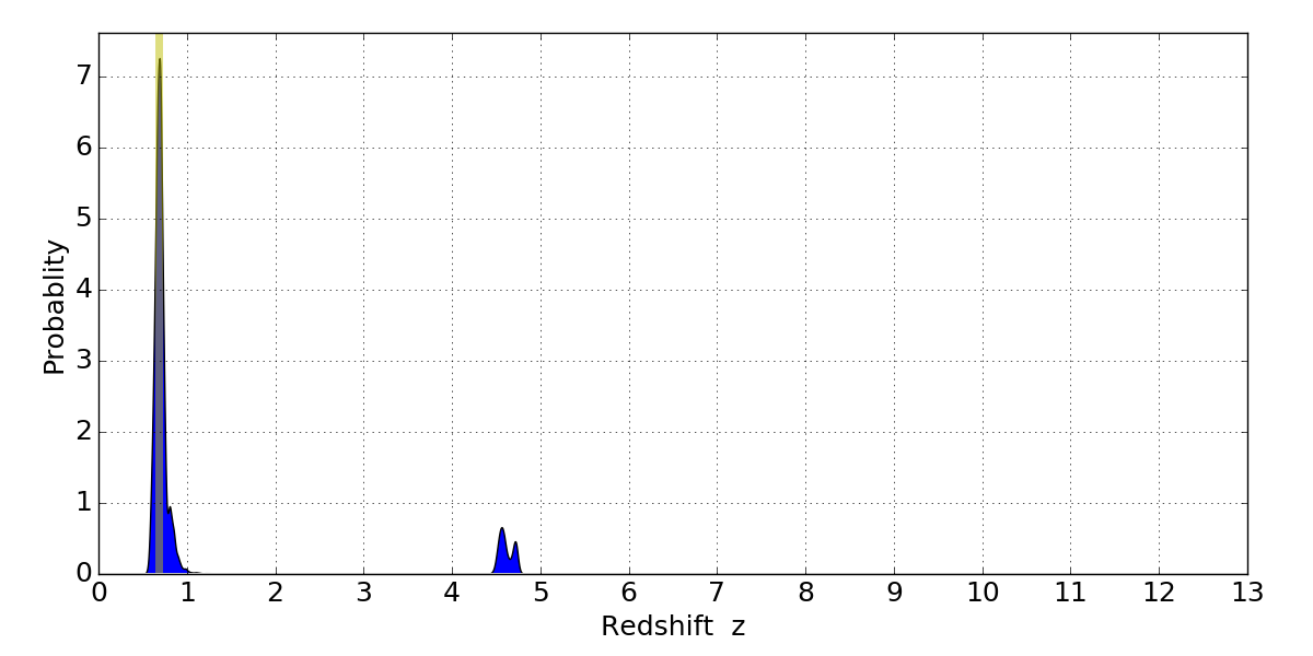 In P(z) plots: Yellow lines mark the cluster redshift z = 0.677,